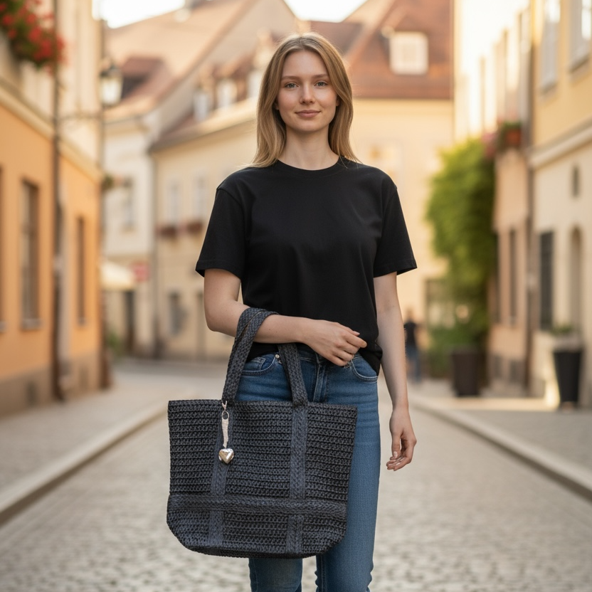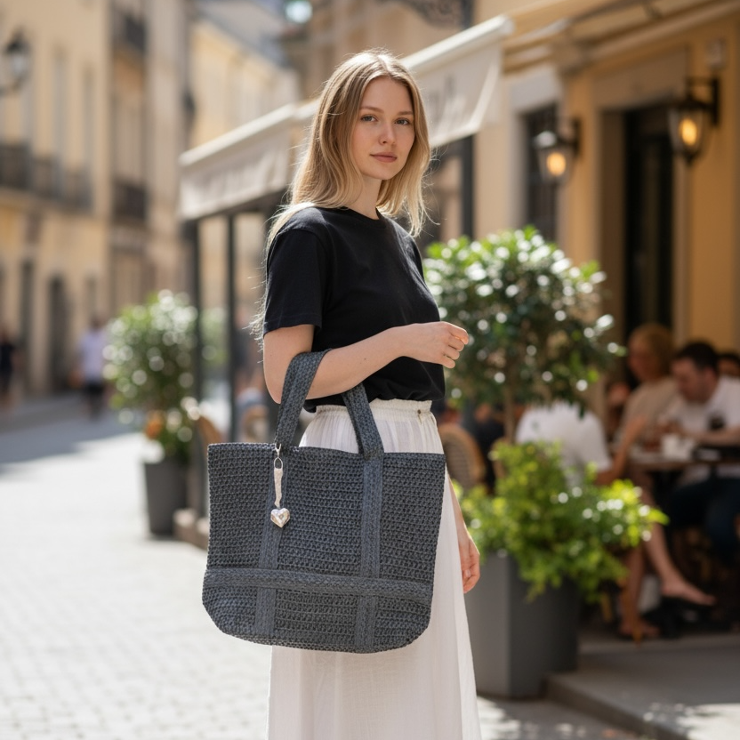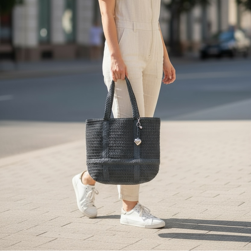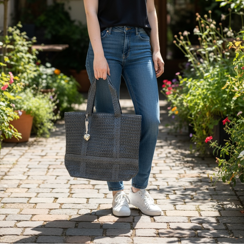 This elegant black carry bag is perfect for shopping trips or beach outings. It comes paired with a heart bag charm, available in two distinct styles: the Autour Du Parfum Paris macrame charm infused with fragrance (offered in black or cream), and the Greenwood Designs large resin hearts, available in five colours. Which style and colour will best complement your look? Choose your preference from the dropdown menu.