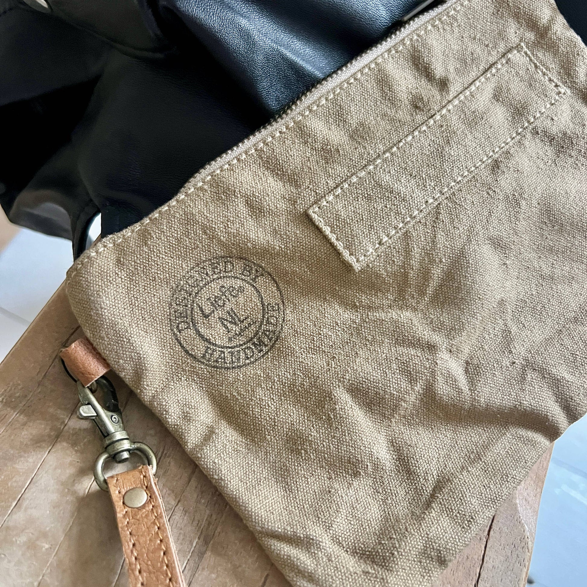 This stylish clutch is made from recycled canvas and secured with a large zipper. It features a recycled leather strap that is detachable via a carabiner. The heart design on the front is hand-painted with love in eco-friendly paint.