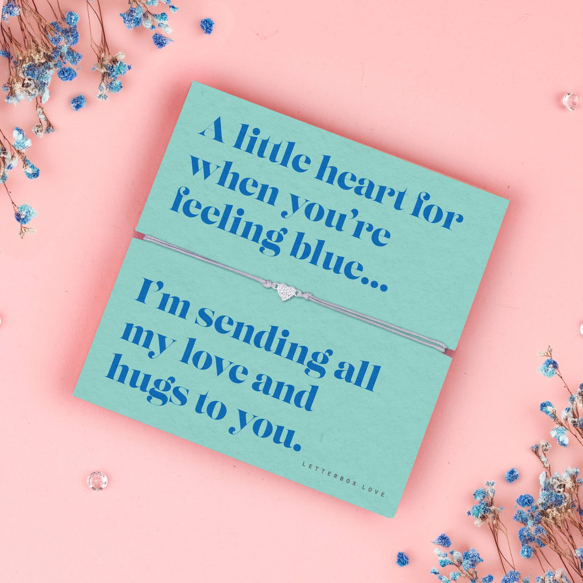 A thoughtful little gift to offer comfort and care when it’s needed most. The Sending Hugs bracelet features a delicate heart charm on an adjustable thread, mounted on a vibrant blue poem card that reads: “A little heart for when you're feeling blue, I'm sending all my love to you.”