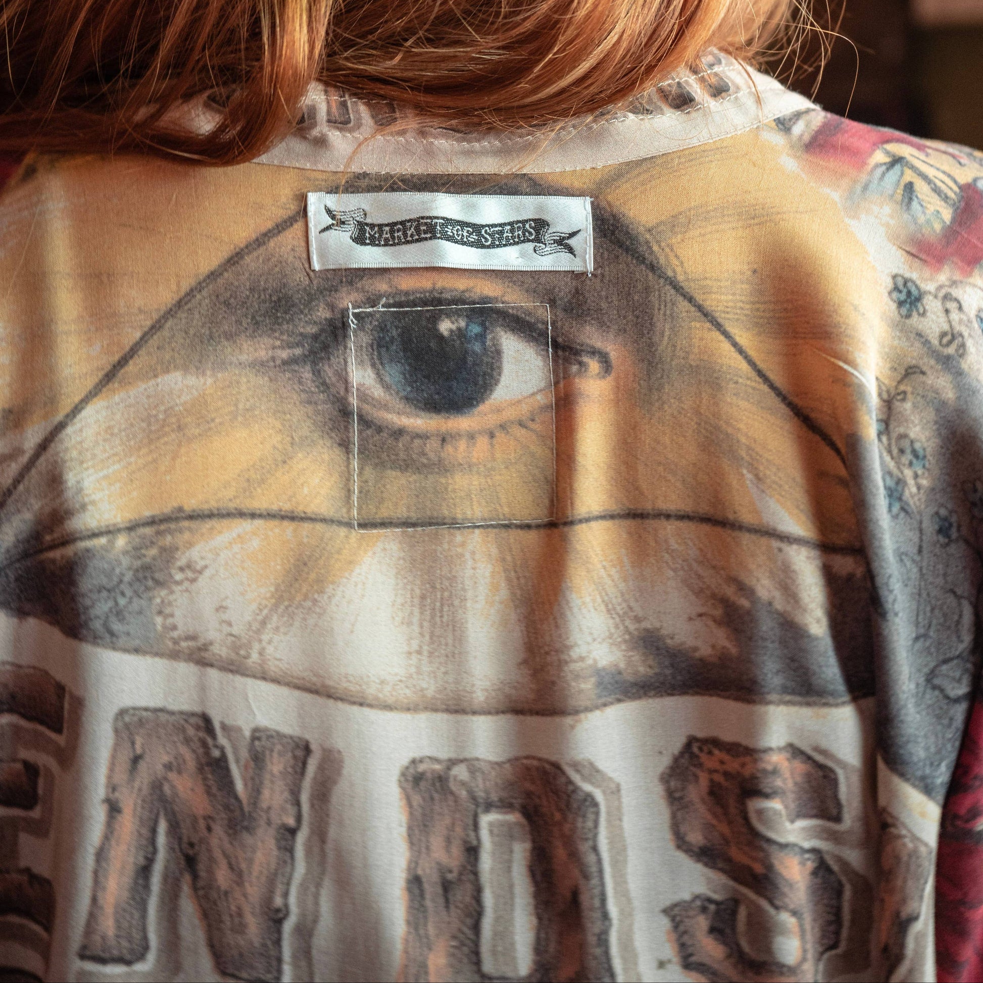 This eclectic, super cool pixie duster cropped kimono was designed from an 1880s archival print and adapted the utterly charming wood-grain lettering to build the trim. The result is beautiful and completely unique, with a lot of romance, and a touch of rock and roll.