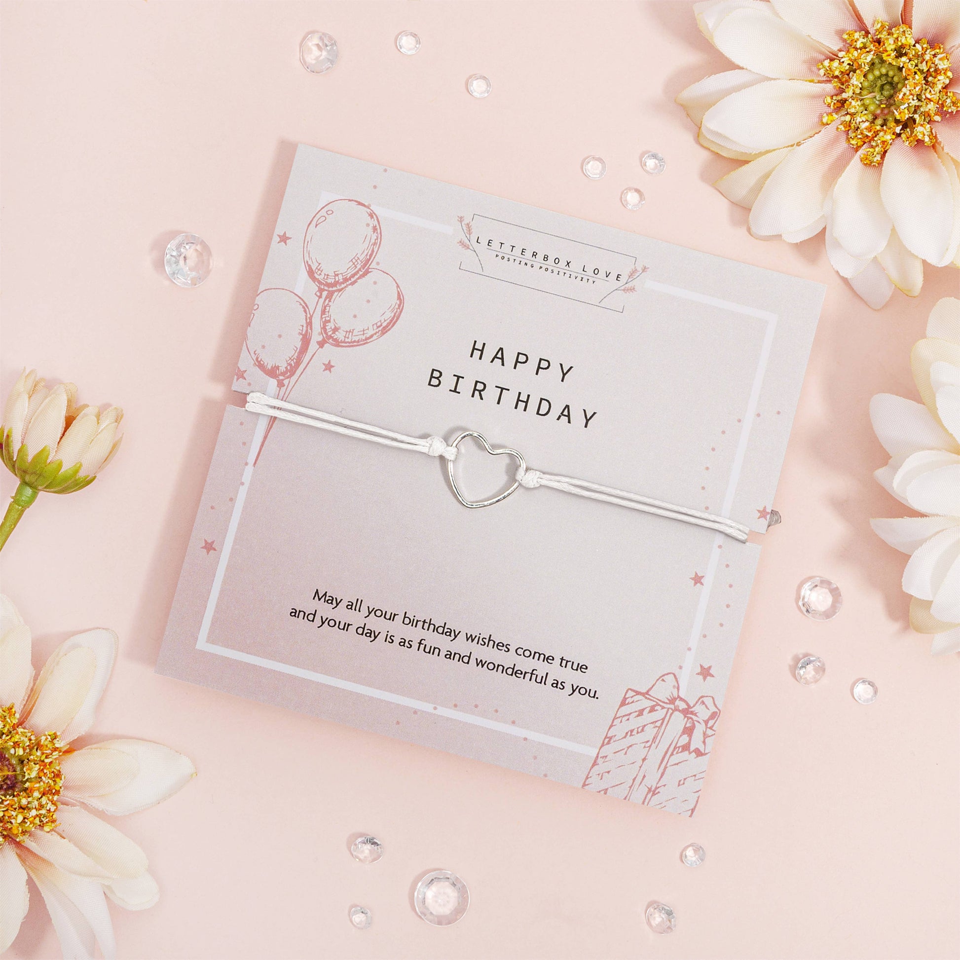 Celebrate her special day with a meaningful bracelet gift! Our bestselling birthday bracelet features a hollow heart charm on soft white thread, mounted on a celebratory poem card.