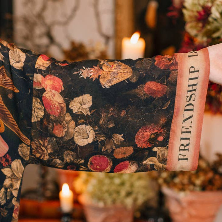Designed using an intricate collage of antique artwork, it features hand-painted swallows from an 1865 scrapbook, floral wreaths done in the 1600s, and a very special sacred heart from Notre Dame in France, which was embroidered with gilded thread and completed in 1872. This print is rich in history, but also in meaning.