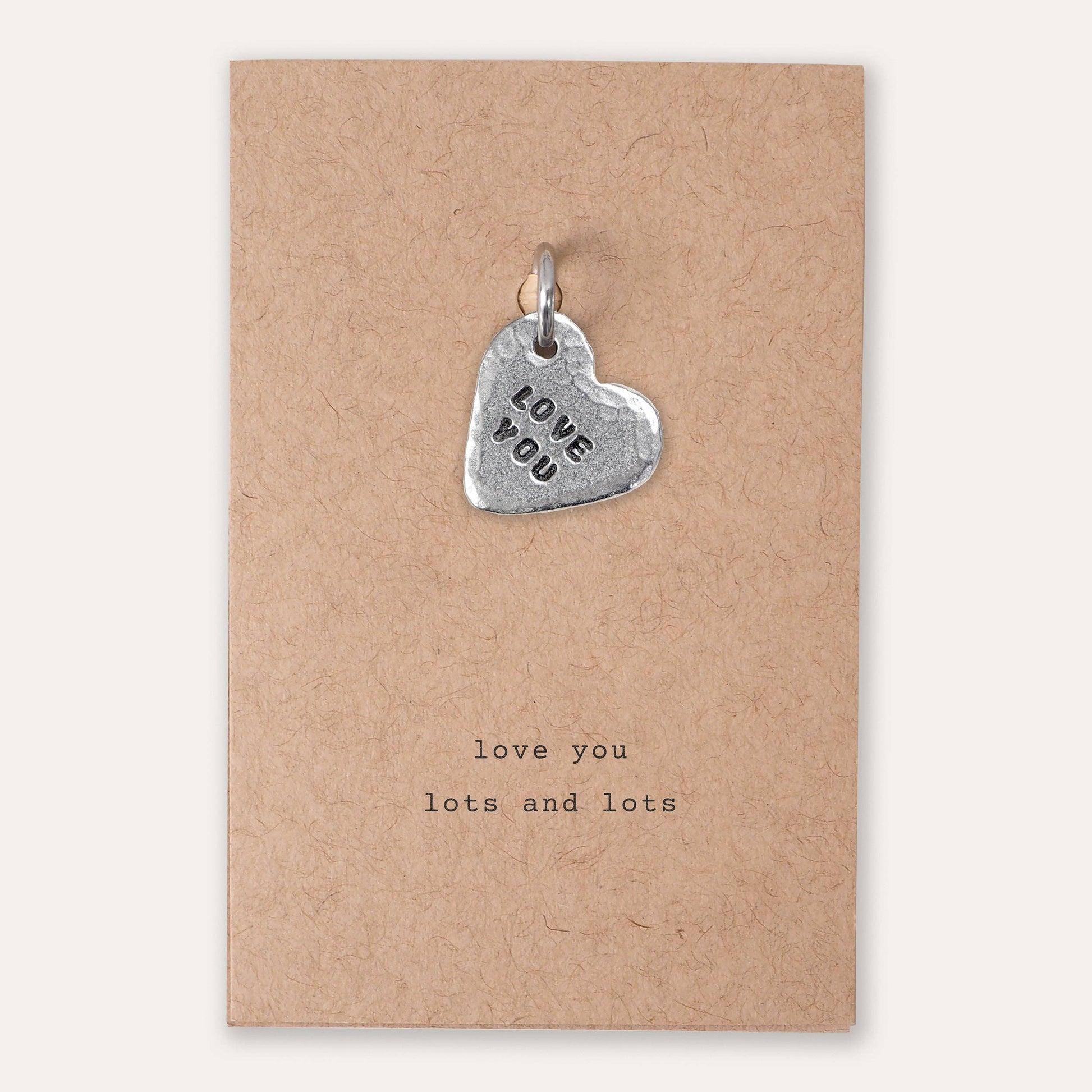A little heart for someone you hold a lot of love for. This small heart charm can be added to your Kutuu keyring. It is stamped with "love you" and given a gently beaten texture. It is attached to a card that reads "love you lots and lots" with space inside where you could write a little love note.