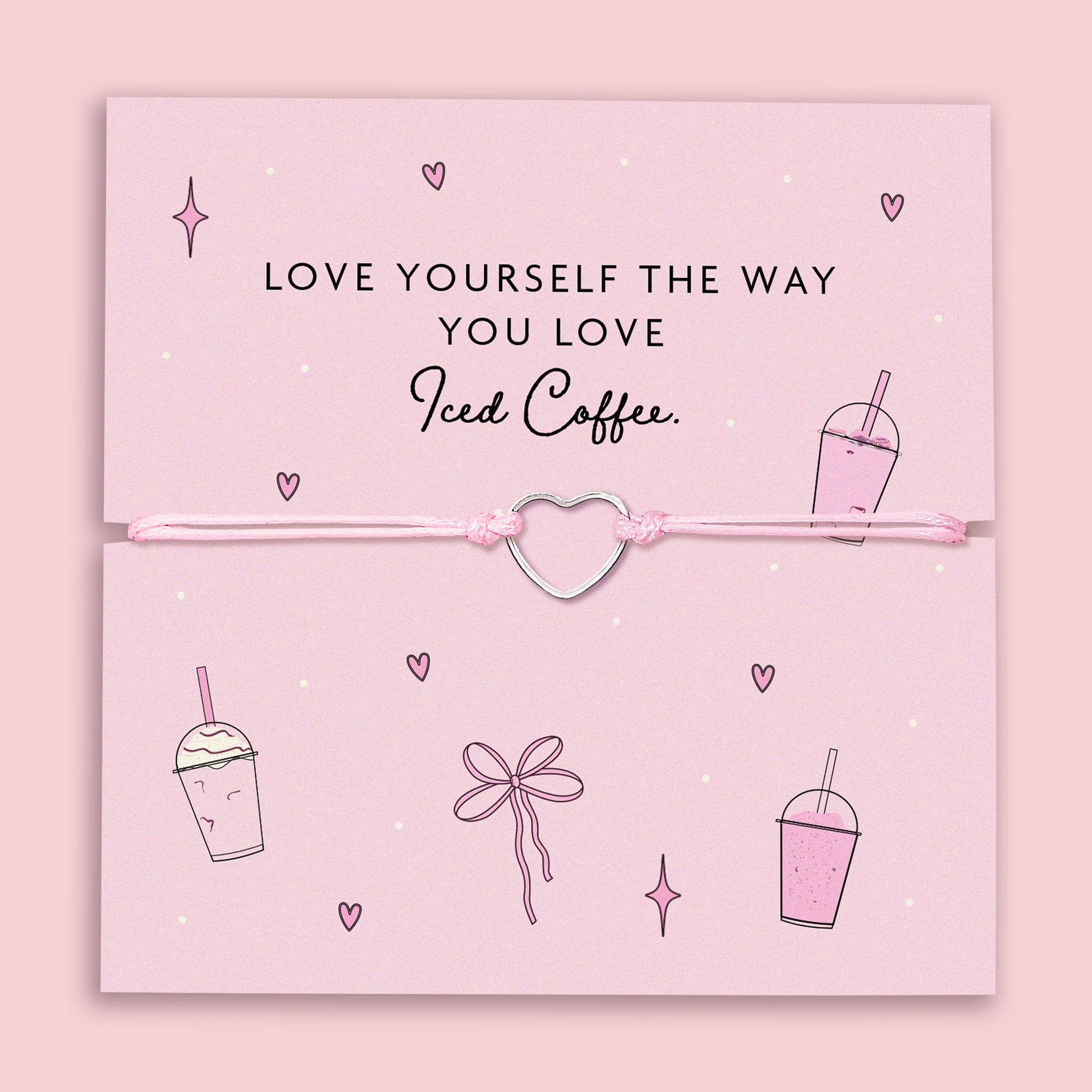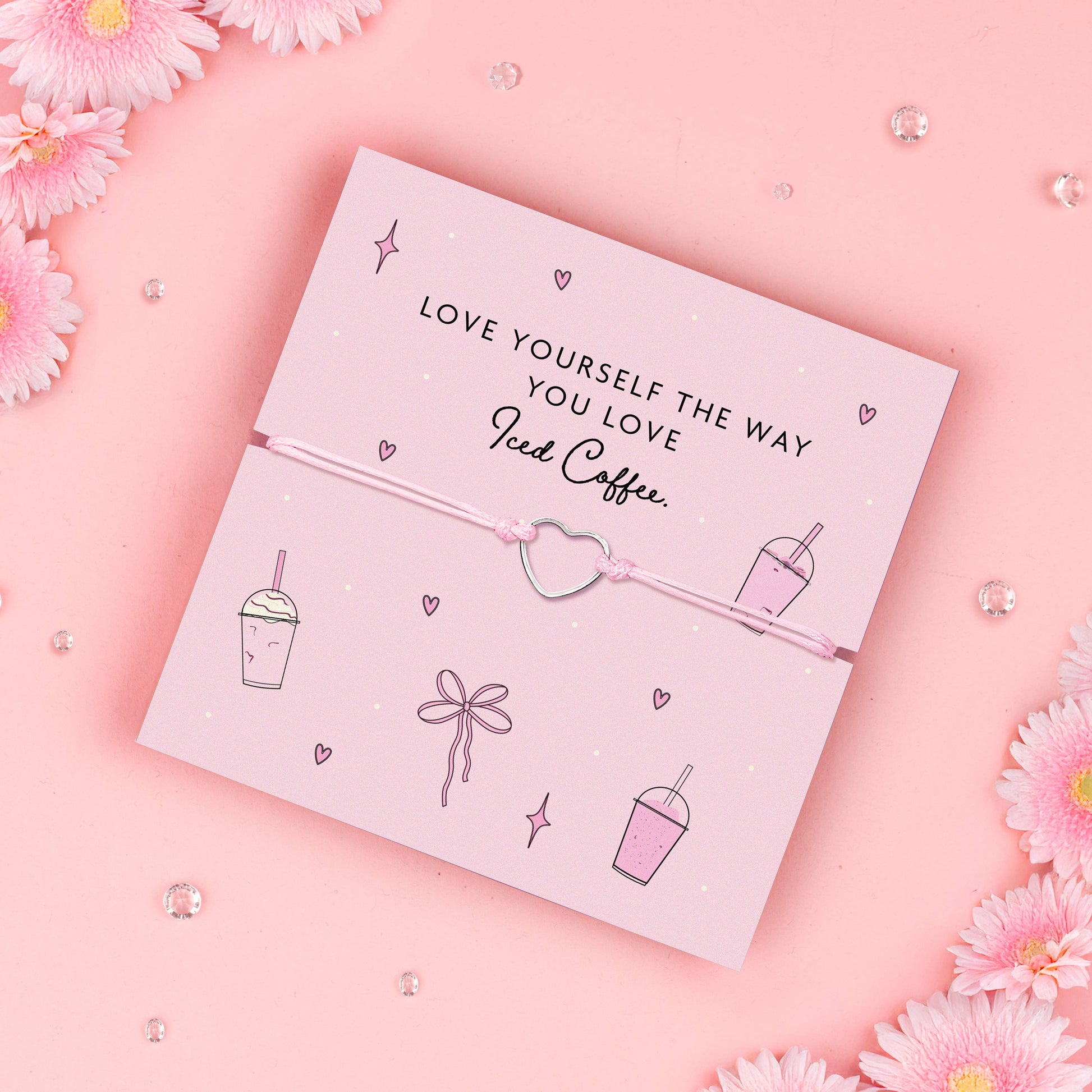 Featuring a dainty silver-tone heart charm on a soft pale pink adjustable cord, this bracelet is mounted on a pastel-themed card adorned with charming, iced coffee illustrations and the feel-good message. It’s the perfect affordable gift for birthdays, self-care moments, or just because, full of personality and positivity.