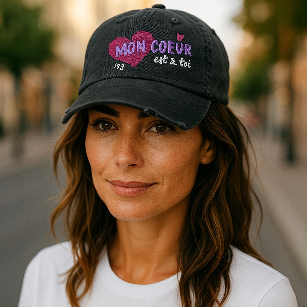 The Bespoke Hearts "Mon Coeur Est à Toi," which means "My Heart is Yours" in French, features vibrant embroidery on a distressed black baseball cap. The number "143" represents the phrase "I love you." It also has a small pink heart on the back.