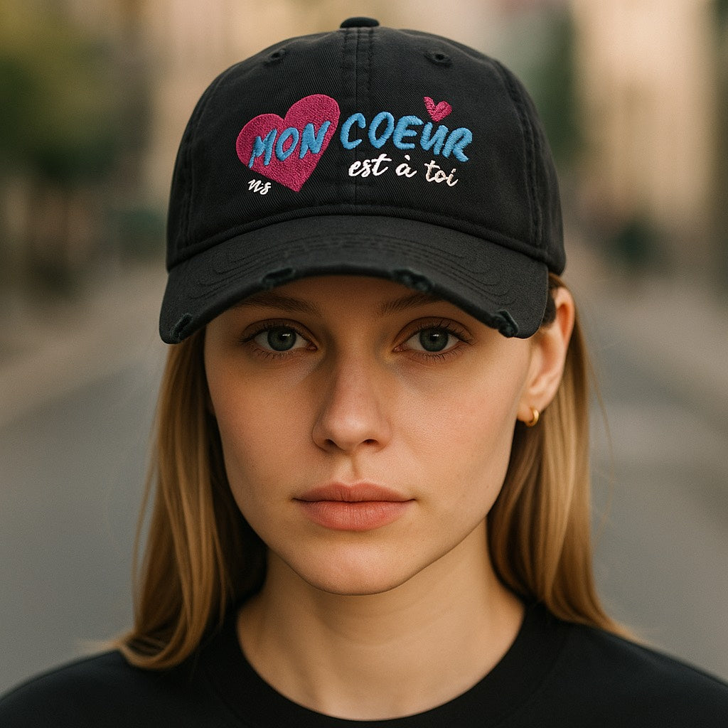 The Bespoke Hearts "Mon Coeur Est à Toi," which means "My Heart is Yours" in French, features vibrant embroidery on a distressed black baseball cap. The number "143" represents the phrase "I love you." It also has a small pink heart on the back.