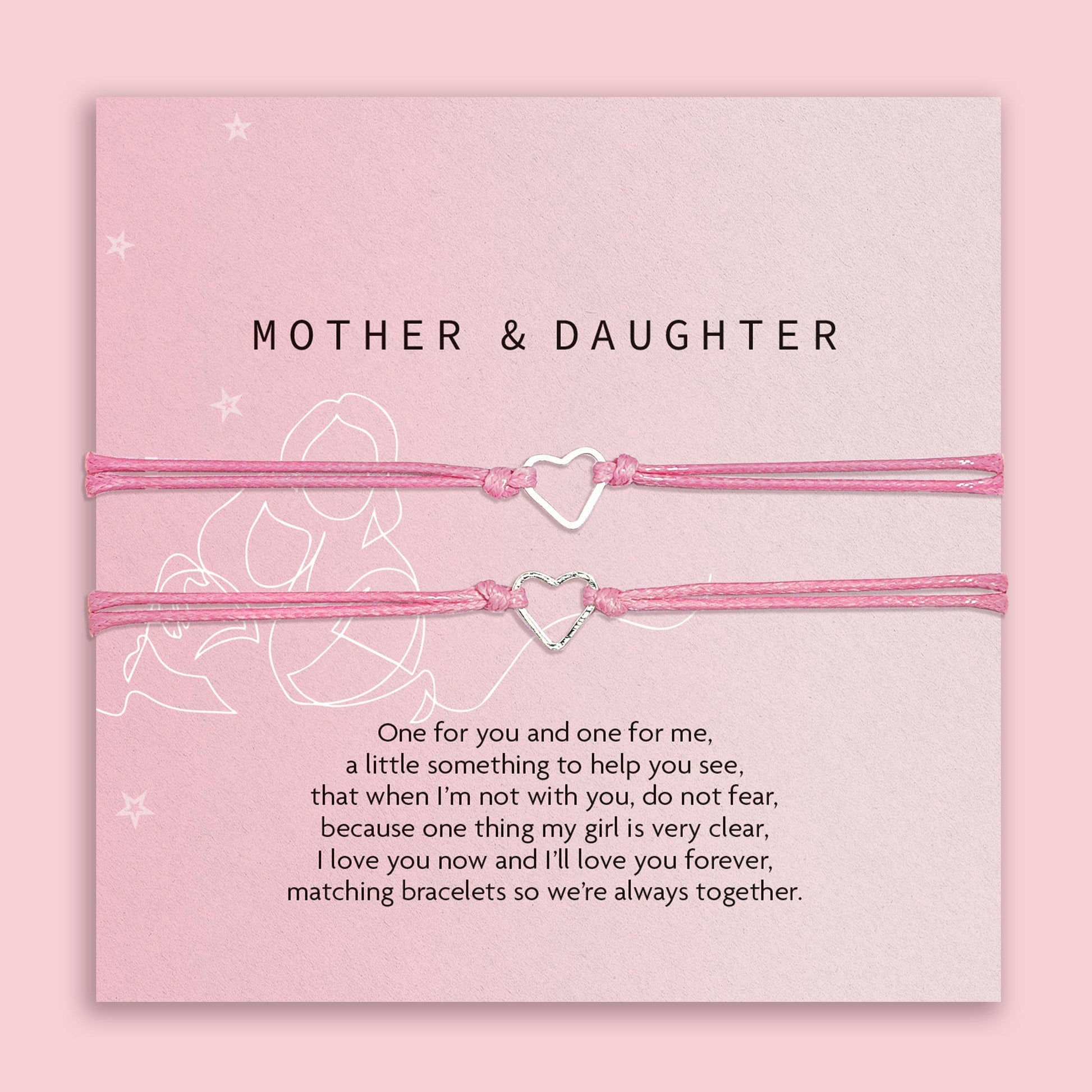 Each set includes two dainty bracelets in soft pink, each featuring a silver heart pendant that symbolises love and connection. Designed with adjustable sizing for both adults and children, these bracelets are comfortable for everyday wear.