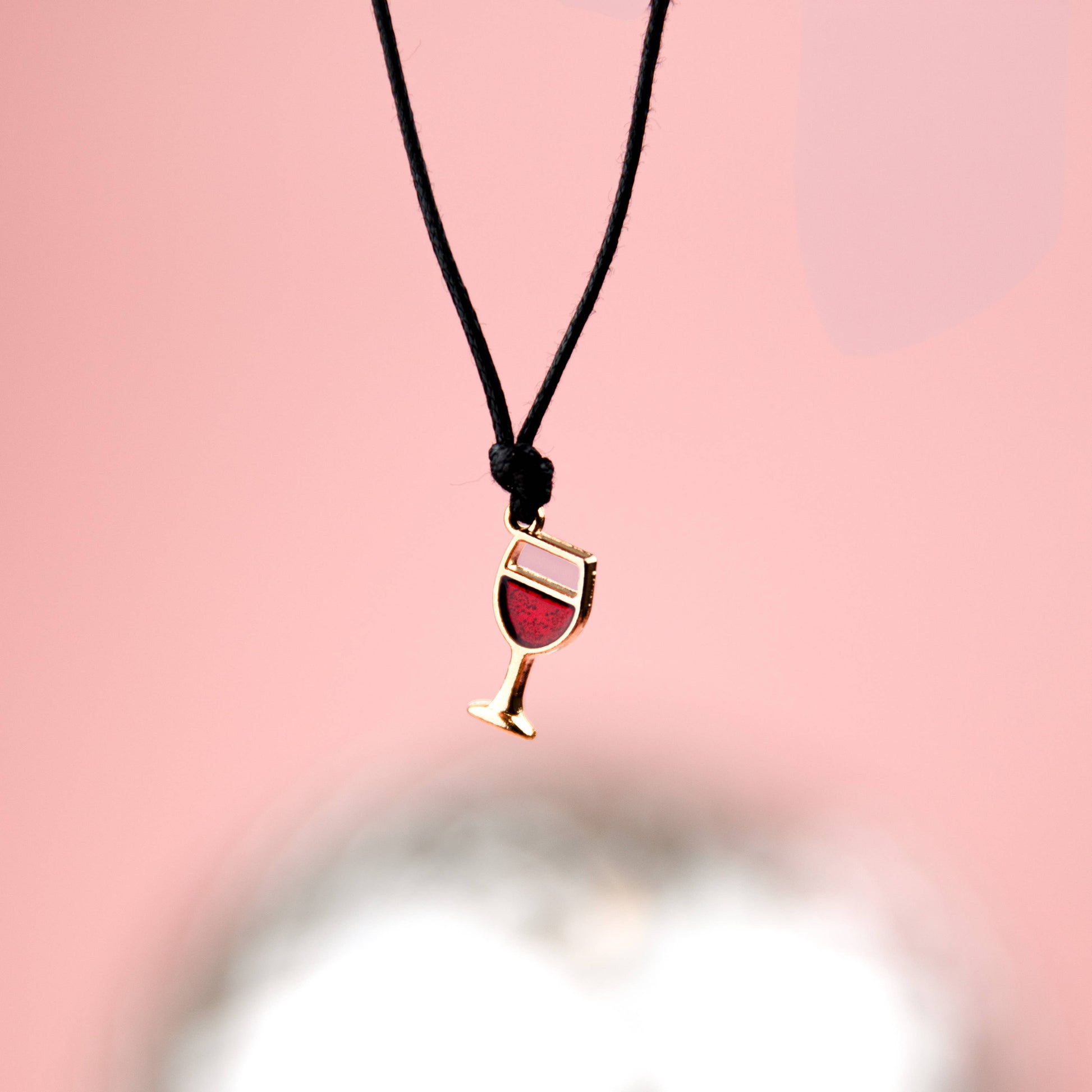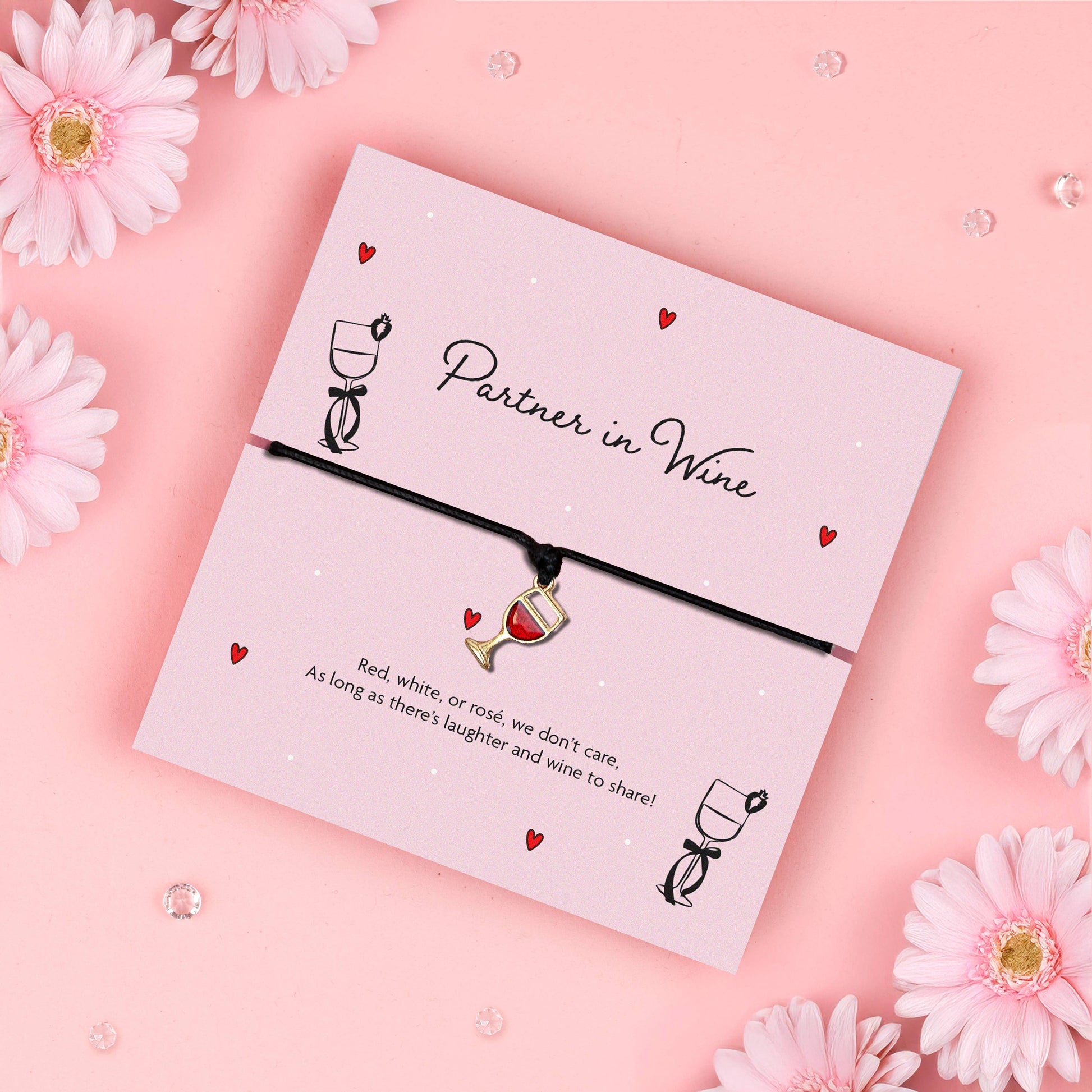 Featuring a glossy red enamel wine glass charm on a sleek black string bracelet, it’s a playful and heartfelt celebration of good times and great company. Mounted on a pink card with mini hearts and a witty wine-themed rhyme, it’s perfect for birthdays, Galentine’s, or just because.