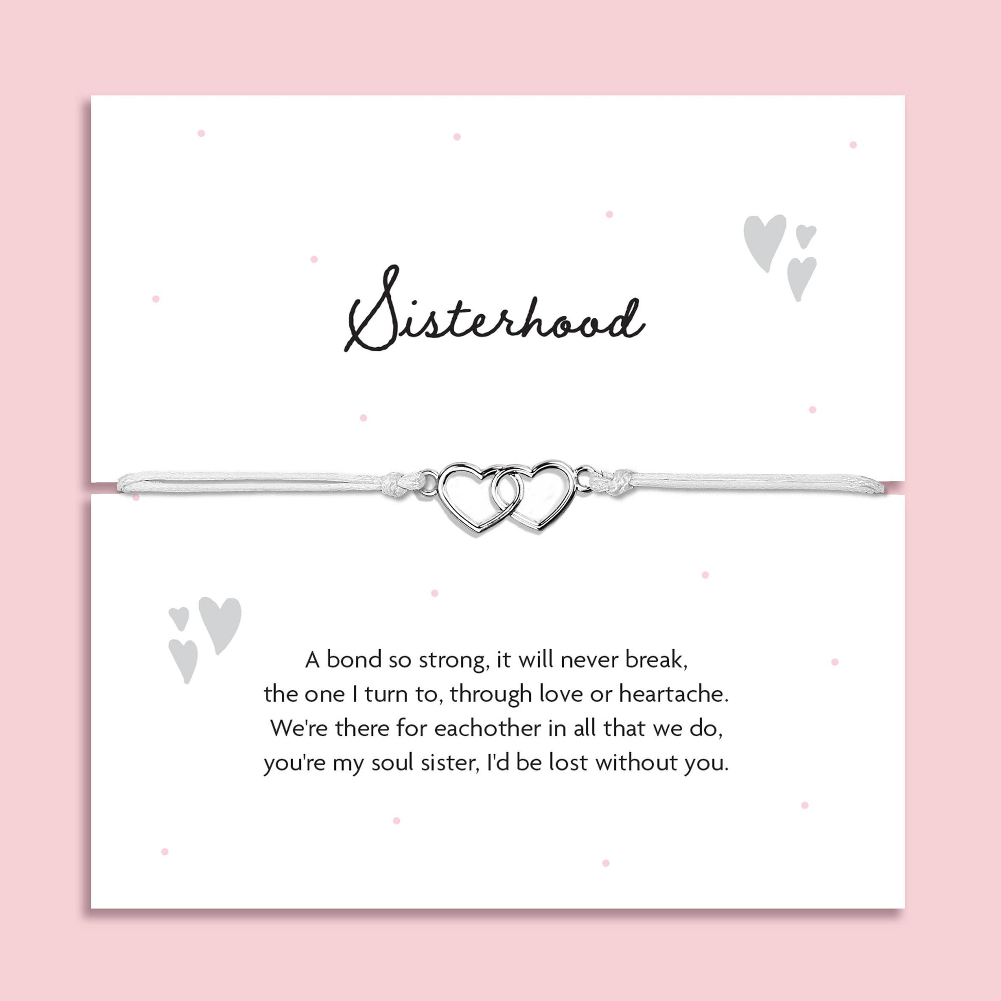 Featuring a delicate pair of silver-tone interlocking hearts on a soft white cord, this bracelet represents love, loyalty, and lifelong friendship. The bracelet is mounted on a beautifully illustrated card friendship card.