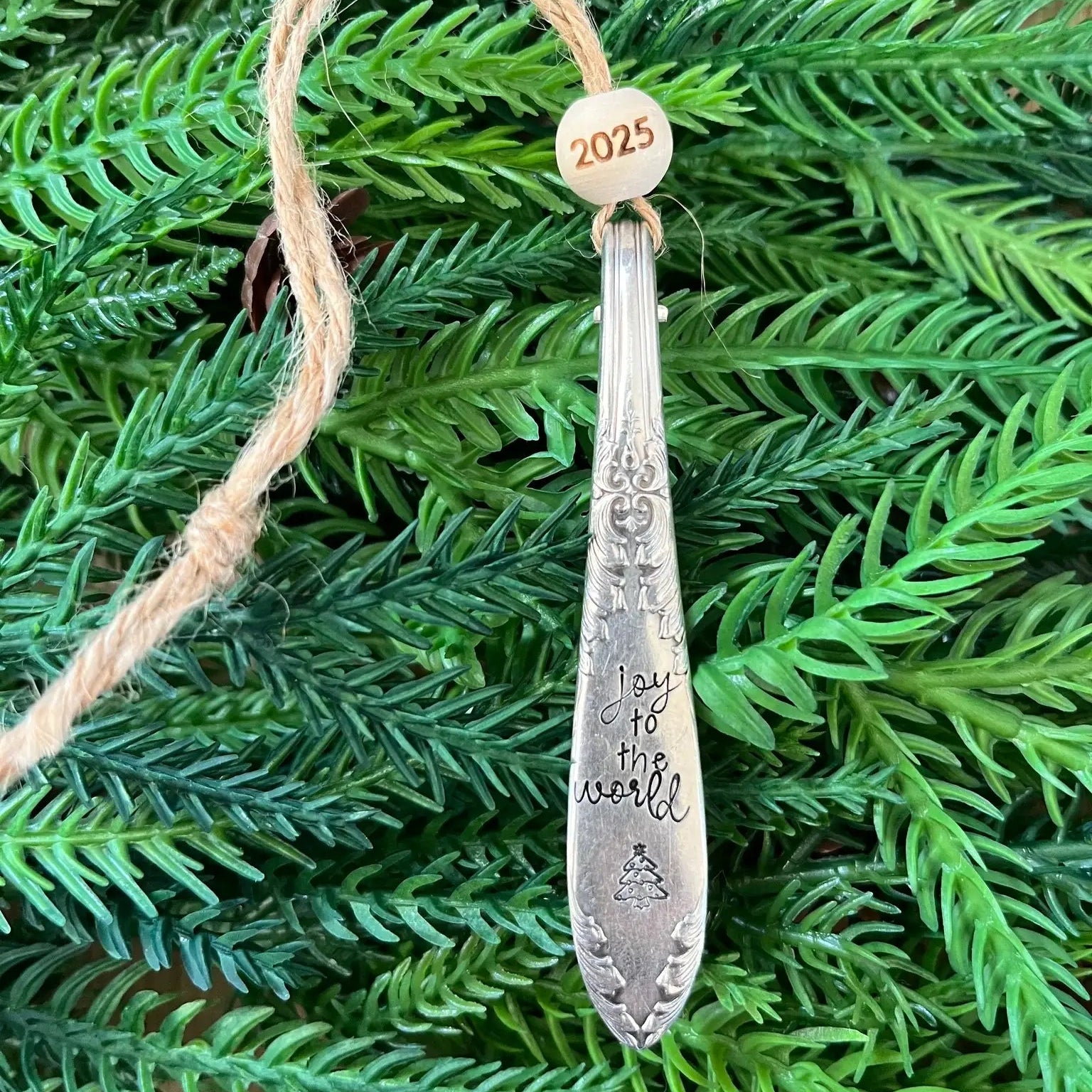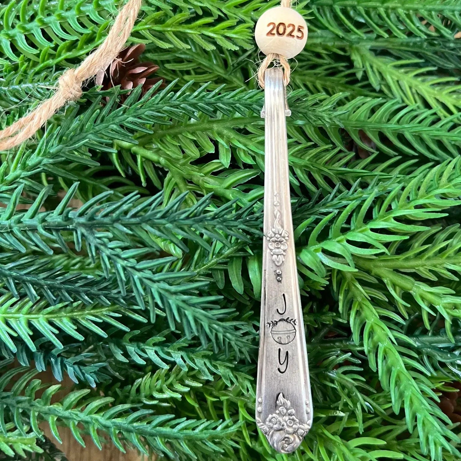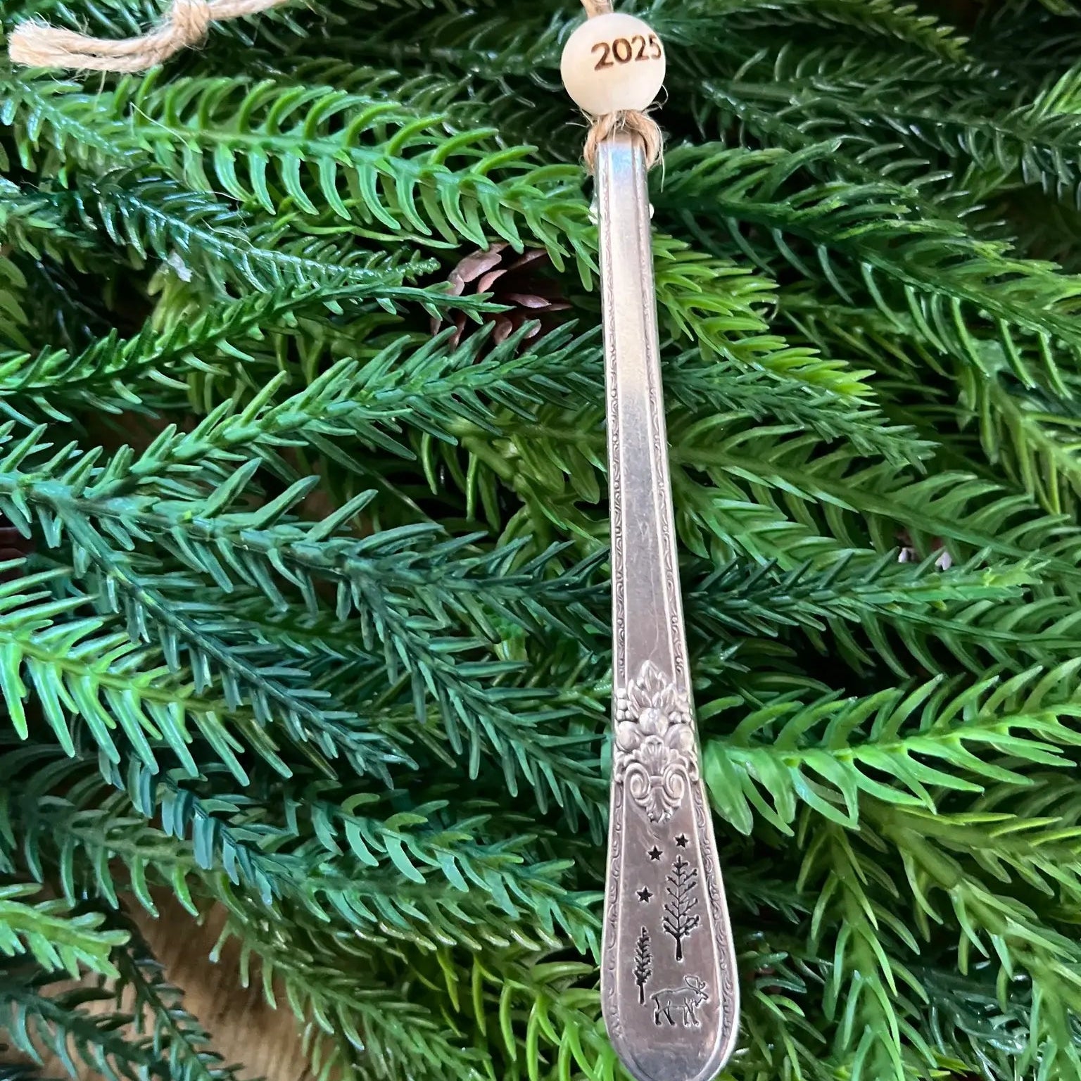 A curated collection of five distinctive ornaments, each crafted and hand stamped from vintage spoon stems featuring elegant holiday motifs paired with a 2025 commemorative bead. This assortment presents one unique design per piece, offering a refined addition to your festive décor with timeless charm and nostalgic appeal.