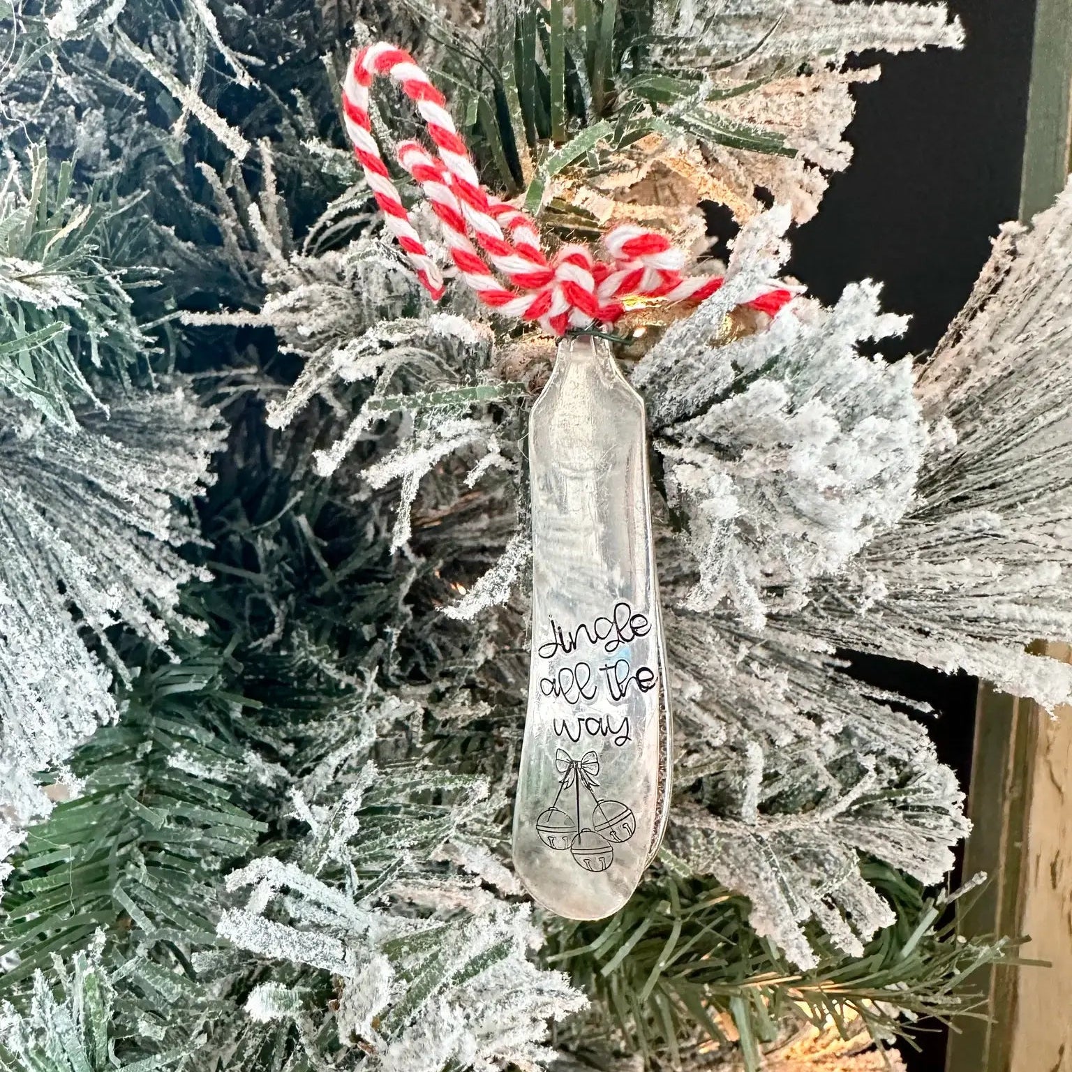 Elevate your festive décor with this distinctive ornament set featuring vintage knives transformed into cherished keepsakes. Each piece bears an engraved sentiment - one with "Jingle all the way" and the other celebrating "believe in the magic" creating a thoughtful pairing that blends nostalgia with holiday charm. A refined addition for those who appreciate unconventional seasonal treasures.